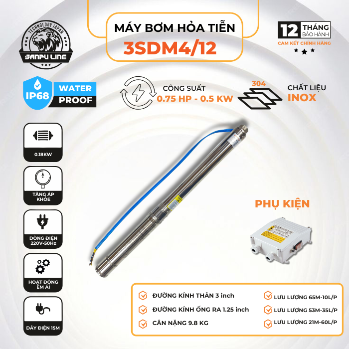 Máy bơm hỏa tiễn 3SDM4/12 là lựa chọn hoàn hảo cho nhu cầu khai thác nước giếng khoan sâu. Với thiết kế hiện đại, trục bơm và thân bằng inox chống gỉ, máy đảm bảo độ bền vượt trội và hoạt động ổn định lâu dài. Lưu lượng nước mạnh mẽ, cột áp cao, thích hợp cho tưới tiêu nông nghiệp, cấp nước sinh hoạt và công trình dân dụng. Đặc biệt, máy vận hành êm ái, tiết kiệm điện, thích ứng tốt với môi trường khắc nghiệt. 3SDM4/12 mang đến giải pháp khai thác nước an toàn, hiệu quả, đáp ứng tối đa nhu cầu sử dụng cả trong hộ gia đình lẫn sản xuất quy mô lớn.