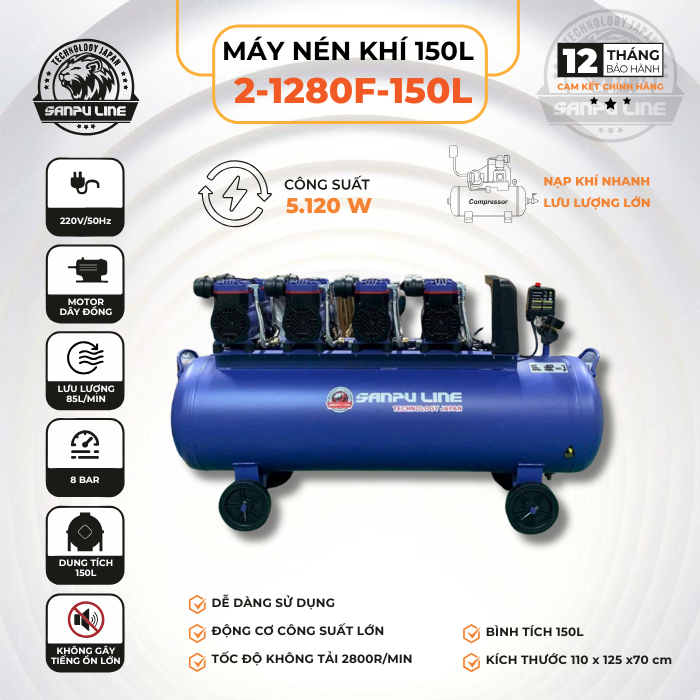 Máy nén khí 2-1280F-150L là dòng máy nén khí piston dung tích lớn, chuyên dùng trong các gara ô tô, tiệm rửa xe, tiệm sửa xe máy, xưởng mộc, cơ khí hoặc dây chuyền sản xuất quy mô vừa – lớn. Với bình chứa 150 lít, máy cho thời gian sử dụng khí nén dài hơn, giúp duy trì áp lực ổn định cho các công việc liên tục. Máy hoạt động mạnh mẽ và lưu lượng khí dồi dào, phù hợp sử dụng với nhiều loại thiết bị như: súng xịt bụi, bắn bulong, bắn đinh, phun sơn… Máy vận hành bền bỉ, làm việc êm ái và tiết kiệm điện năng. Thiết kế chắc chắn, có bánh xe và tay kéo, dễ di chuyển trong xưởng. Vỏ bình sơn tĩnh điện chống gỉ, tăng tuổi thọ thiết bị. Máy nén khí 150L là lựa chọn lý tưởng cho khách hàng cần thiết bị mạnh – bền – khí nén lớn – dùng được nhiều việc trong thời gian dài.
