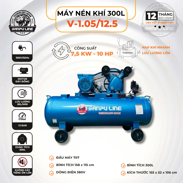 Máy nén khí 300L V-1.05/12.5 là dòng máy nén khí piston công nghiệp cao cấp, phù hợp cho xưởng sản xuất lớn, gara ô tô chuyên nghiệp, tiệm rửa xe công nghiệp, xưởng cơ khí hoặc dây chuyền cần khí nén liên tục và mạnh mẽ. Với bình chứa khí siêu lớn 300 lít, máy đảm bảo lượng khí dự trữ dồi dào, duy trì áp lực ổn định cho các thiết bị hoạt động không ngừng nghỉ. Công suất lớn, giúp nạp khí nhanh, vận hành ổn định và tản nhiệt tốt. Thiết kế bình sơn tĩnh điện, khung thép chắc chắn, có bánh xe lớn và tay kéo, dễ di chuyển trong nhà xưởng. Máy nén khí 300L V-1.05/12.5 là lựa chọn hàng đầu cho người dùng cần thiết bị khí nén công suất lớn – khí nhiều – áp khỏe – độ bền cao.