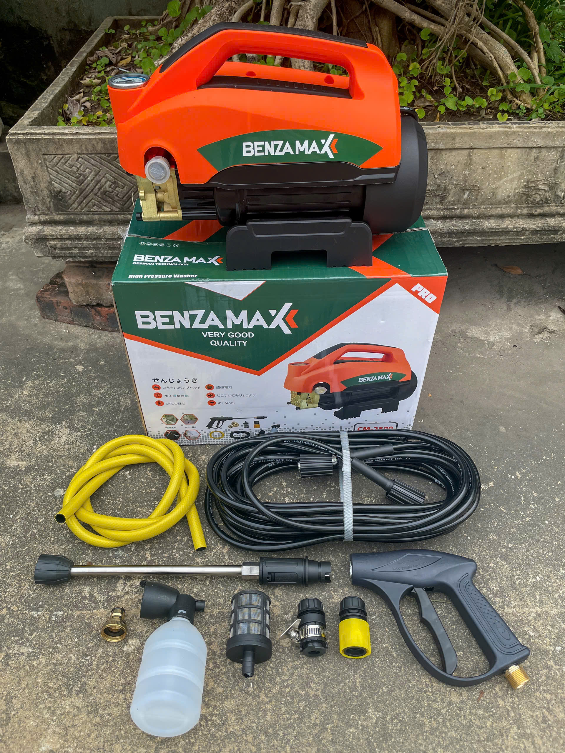 Máy rửa xe CM-2500 là dòng máy xịt rửa cao áp cải tiến, sở hữu động cơ dây đồng mạnh mẽ, cho áp lực phun khỏe, dòng nước ra ổn định, giúp làm sạch xe máy, ô tô, sân vườn, điều hòa, chuồng trại… một cách nhanh chóng. Thiết kế máy chắc chắn, hiện đại, có tay xách tiện lợi, dễ di chuyển và cất giữ. CM-2500 hỗ trợ tự hút nước từ xô, chậu, hoạt động ổn định ngay cả khi không có áp lực nước đầu vào mạnh. Máy đi kèm bộ phụ kiện đầy đủ giúp người dùng thao tác thuận tiện và tiết kiệm thời gian. Công nghệ motor cảm ứng giúp máy hoạt động êm, ít nóng, độ bền cao, phù hợp sử dụng cho cả gia đình lẫn tiệm rửa xe.